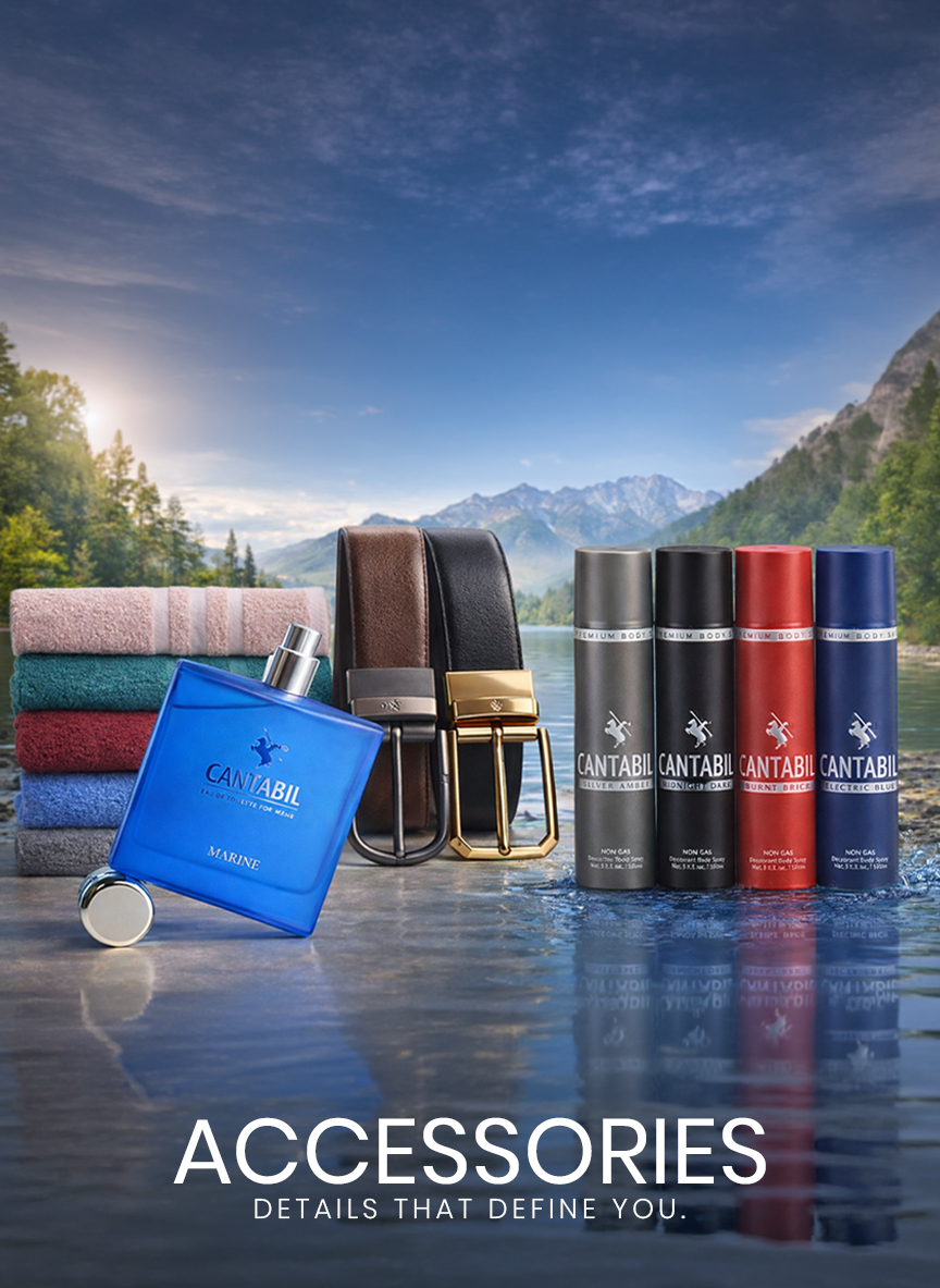 From refreshing perfumes, deodorants, body mists, and body lotions that keep you feeling fresh and confident, to sharp tie sets, ties, mufflers, stoles, and caps that refine every outfit with effortless polish. Our wallets, belts, and scarves bring everyday functionality without compromising on style, while our backpacks and trolley bags are built for those always on the move. Towels and socks round off our essentials range, ensuring Cantabil takes care of you from head to toe, inside and out.